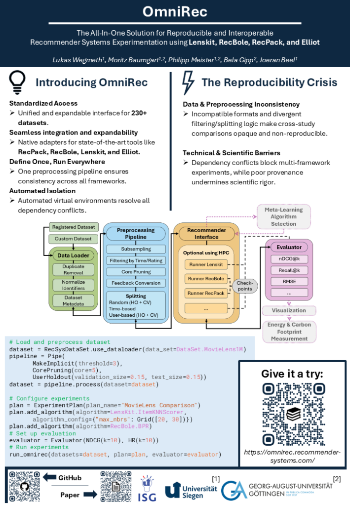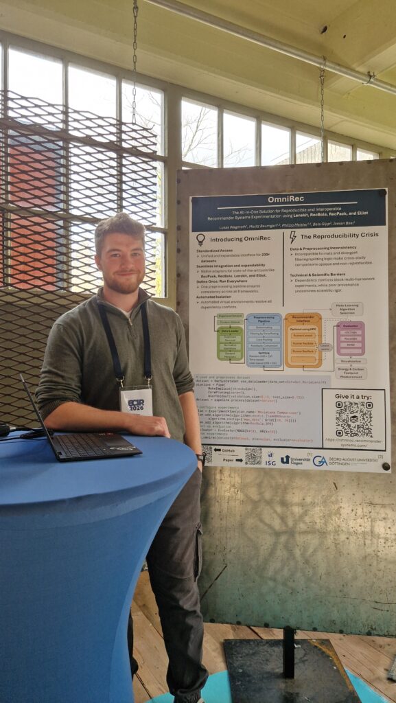 We are excited to announce that our research assistant, Philipp Meister, recently presented our demo paper on OmniRec as a poster at ECIR 2026 in Delft. OmniRec is a new open-source Python library for unified RecSys experiments with popular libraries like Lenskit, RecBole, RecPack, and Elliot.