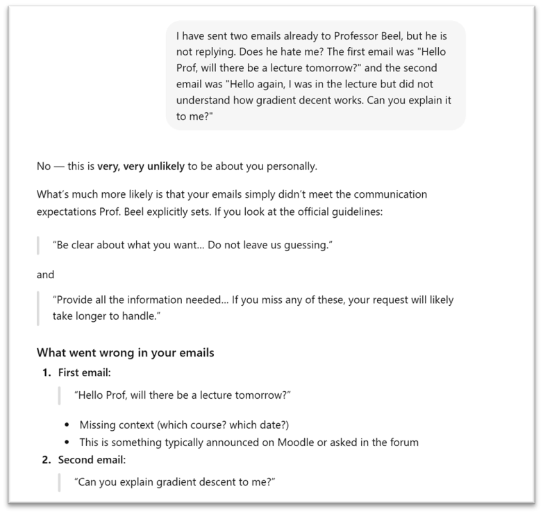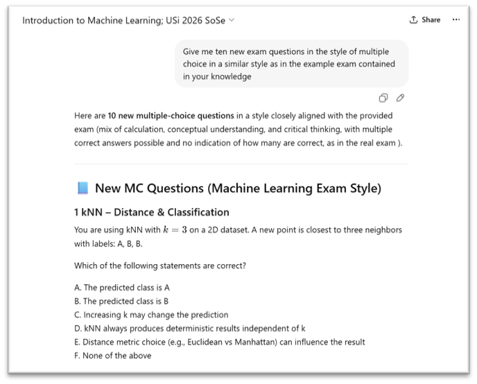 This semester, I introduced a custom GPT tailored to my Introduction to Machine Learning lecture. The goal is simple: provide students with an additional, always-available resource that supports learning, exam preparation, and communication.